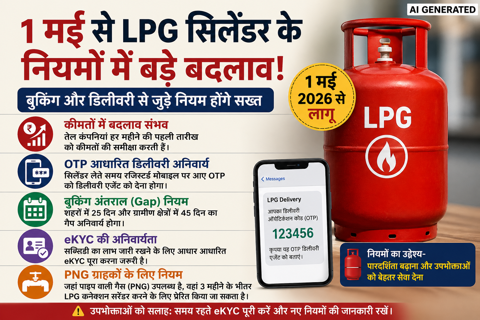 LPG गैस सिलेंडर से जुड़े नियमों में 1 मई 2026 से बदलाव होने की संभावना जताई जा रही है। तेल कंपनियां हर महीने की शुरुआत में कीमतों की समीक्षा करती हैं, ऐसे में इस बार भी गैस सिलेंडर की कीमतों में बदलाव देखने को मिल सकता है। हाल ही में घरेलू सिलेंडर के दाम में बढ़ोतरी दर्ज की गई थी, जिसके बाद उपभोक्ताओं की नजर अब नई दरों पर टिकी है।